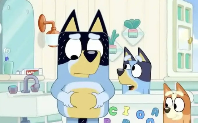 During an episode of the popular Australian TV show about a family of dogs, Bluey's parents complain about their weight gain, while Bluey's father holds his stomach with his hands.< /p>