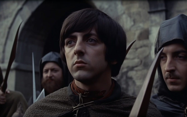 However, two weeks ago, 24 frames from this unmade film appeared on the network. There was Paul in the form of Frodo, peering thoughtfully out of the castle gates in a fleece tunic, and there was a grinning John emerging from the river in mossy overalls and a wreath of seaweed. George with a thick beard was shown in a scarlet magic mantle, trimmed with gold, and in another made of white sheepskin; elsewhere, a circle of minstrels played strange medieval instruments on a clifftop, and a coven of nine Ringwraiths meditated in the swamp, black cloaks fluttering in the wind.