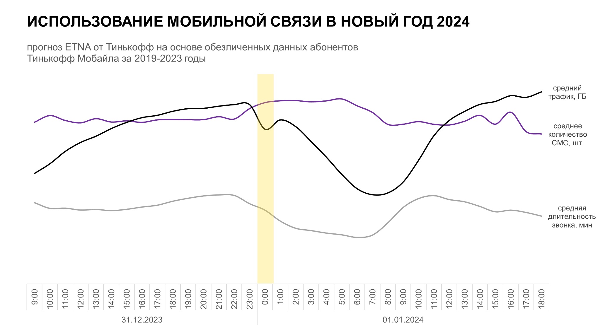 The ETNA analytics service, developed by the Tinkoff Center for Artificial Intelligence Technologies, has compiled a forecast for the use of mobile communications in Russia on New Year's Eve — 2024 and throughout the New Year's Eve. The forecast was built using a set of algorithms, using anonymized data from Tinkoff Mobile subscribers for 2019–2023 as a base.