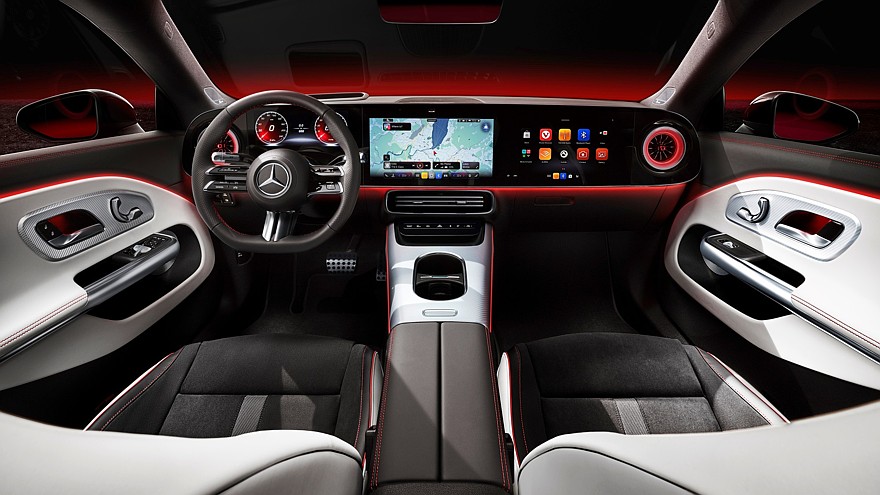 На новом Mercedes-Benz CLA дебютировало салонное табло MBUX Superscreen, заменившее, по сути, переднюю панель или, как минимум, её лицевую часть. Боковые воздуховоды врезаны в это табло, а центральные спущены вниз и дуют в пупок. Отдельного блока микроклимата нет, все настройки зашиты в операционную систему MB.OS, регулировкой громкости заведуют сенсорные ползунки на руле и центральной консоли — в общем, с эргономикой есть очевидные проблемы. Режимами трансмиссии заведует правый подрулевой рычажок.