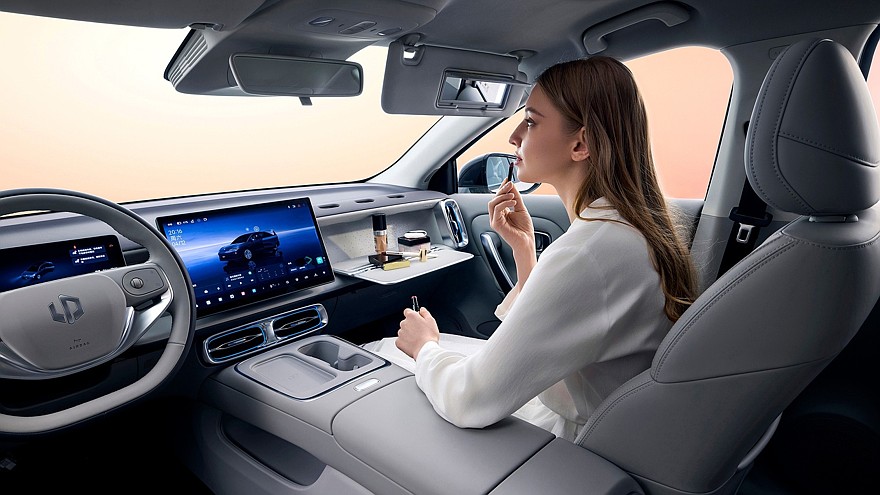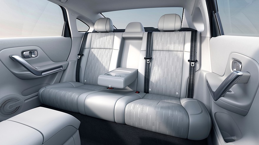 Передние панели салона у седана и кроссовера совершенно одинаковые, со стороны пассажира на передней панели имеются открытая вещая ниша и шесть овальных отверстий для крепления различных аксессуаров — например, раскладного столика для ноутбука, держателя для смартфона или игрушки. Приборный экран — 8,8-дюймовый, центральный мультимедийный экран — 14,6-дюймовый с 2,5К-разрешением. Кресло водителя оснащено обогревом и вентиляцией. Объём багажника — 460 л.