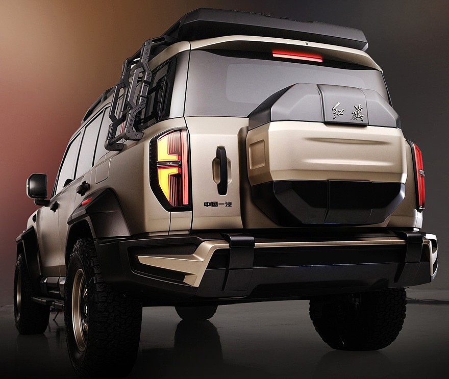 На принадлежность внедорожника к марке Hongqi указывает массивная хромированная радиаторная решётка с красной продольной полоской, олицетворяющей красное знамя. Расширители колёсных арок, которые больше, чем у большинства конкурентов, тоже оснащены краснознамёнными вставками. Высокопрофильные «зубастые» шины и экспедиционный багажник на крыше подчёркивают готовность машины к приключениям. Вместе с тем губа переднего бампера кажется излишне выпяченной, она будет мешать на тяжёлом бездорожье. Впрочем, облик серийного внедорожника, возможно, будет немного иным — будем ждать новой информации от Hongqi.