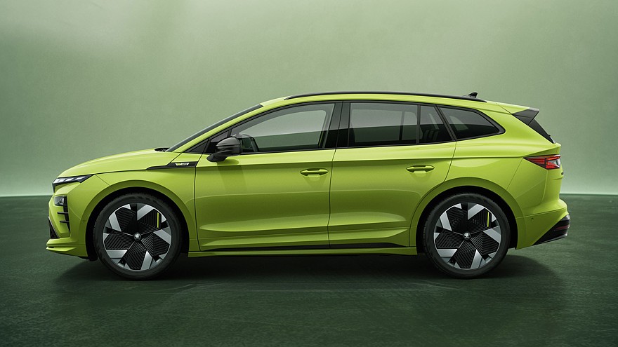 В нижнюю часть переднего бампера интегрирован довольно большой воздухозаборник с необычным рисунком, ниже можно увидеть сплиттер. На боковинах у обновлённых Skoda Enyaq RS и Enyaq Coupe RS имеется шильдик с названием версии, чёрные корпуса наружных зеркал, обычные дверные ручки, окрашенные в цвет кузова, оригинальные колёсные диски (стандартные 20-дюймовые, за доплату доступны 21 дюймовые). У кроссовера с традиционным кузовом на крыше можно увидеть чёрные рейлинги, у кросс-купе чёрным цветом отделан верх.