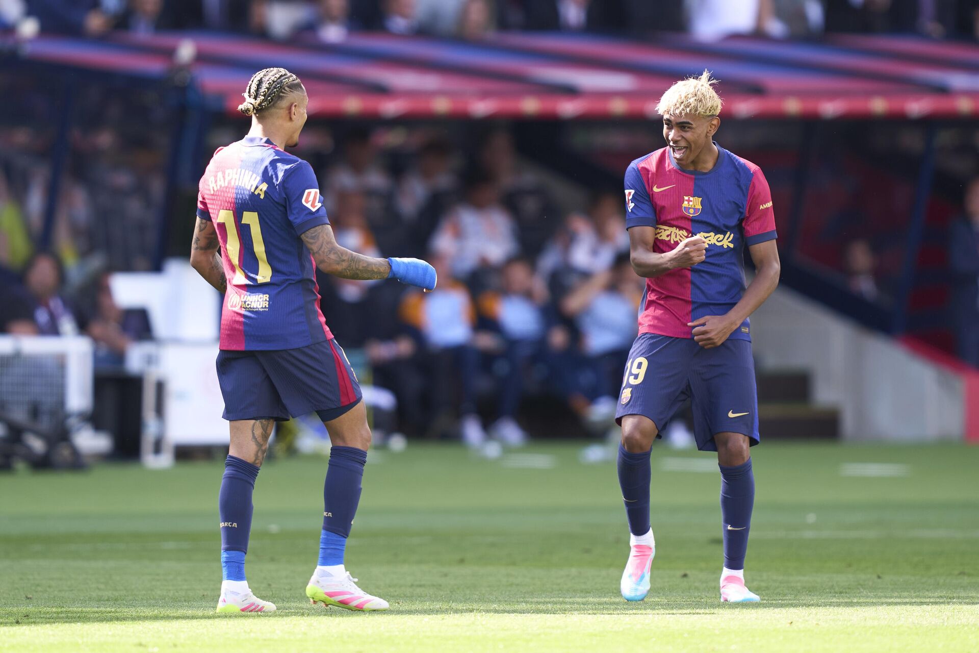 Но это был еще далеко не конец. Событий только первого тайма с лихвой хватило бы на несколько матчей команд, которые не называются «Барселона» или «Реал». Хозяева почувствовали, что отыграться можно уже в ближайшие минуты и продолжили давить — это принесло плоды на 32-й минуте. Ламин Ямаль получил мяч на углу штрафной и снова блеснул, в касание отправив мяч в угол ворот Тибо Куртуа. А спустя две минуты «Барса» и вовсе повела — постарался Рафинья.