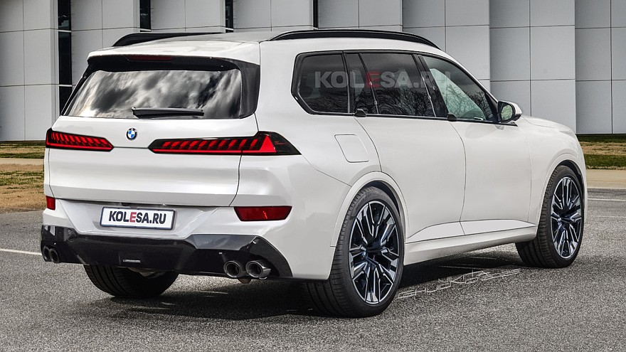 Судя по шпионским фотографиям, кроссовер сохранит привычные пропорции с длинной колёсной базой, большим задним свесом и высокой крышей. Также в BMW решили не отказываться от одного из самых спорных элементов рестайлинговой модели нынешнего поколения — «двухэтажной» передней оптики. Пока кузов скрыт под толстым слоем камуфляжа, но уже проглядываются узкие полоски вдоль кромки капота, где будут располагаться габаритные огни. Их рисунок ещё неизвестен, а на рендере изображён один из возможных вариантов в актуальной стилистике марки с парой вертикальных сегментов с каждой стороны. Основные блоки фар станут чуть меньше по размеру и получат практически квадратную форму. Боковины, скорее всего, лишатся горизонтальной выштамповки в районе дверных ручек, а сами дверные ручки, сделанные в стиле Ford Mustang Mach-E, переместятся на подоконную линию (аналогичными, кстати, будет располагать и один из основных будущих конкурентов модели — новый Audi Q9). Сзади пока ещё больше маскировки, чем спереди, и пока мы можем видеть лишь расположение фонарей, которые могут растянуться практически во всю ширину задней части. Существенным отличием от нынешнего Х7 станет расположение ниши номерного знака, которая переместится с крышки багажника на задний бампер. Наконец, попавшийся фотошпионам прототип имеет четыре круглых патрубка выхлопной системы, что отражено и на нашем рендере.