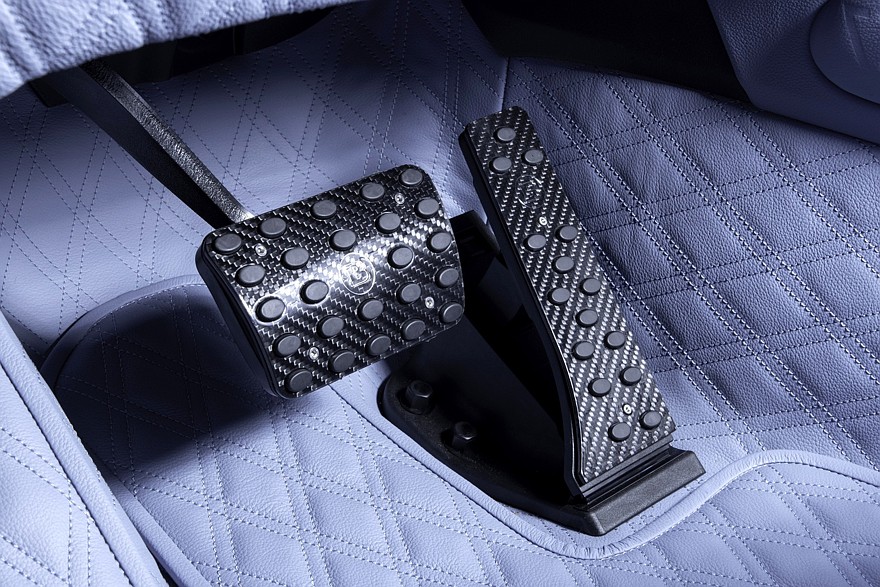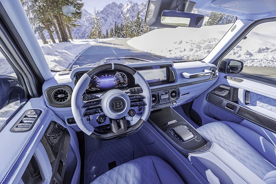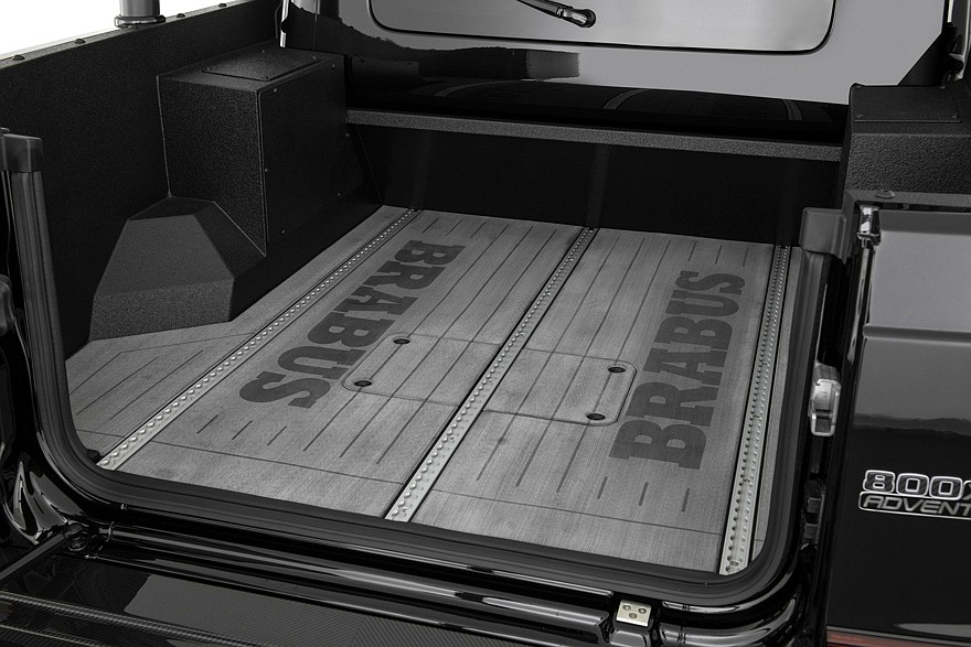 Салон Brabus XLP 800 Adventure обшит перфорированной кожей и замшей, потолок имеет центральную вставку с орнаментом из цифр 77, указывающих на год основания компании Brabus — 1977-й. Передняя панель, центральный тоннель и дверные карты щедро декорированы лакированным углепластиком. Этим же материалом покрыты педали, но есть у них и резиновые вставки для уверенного контакта с ногами водителя. Пассажиры второго ряда получили собственный потолочный щиток приборов со спидометром и диаграммой ускорений. Задние двери с уникальными петлями могут открываться на угол до 90 градусов.