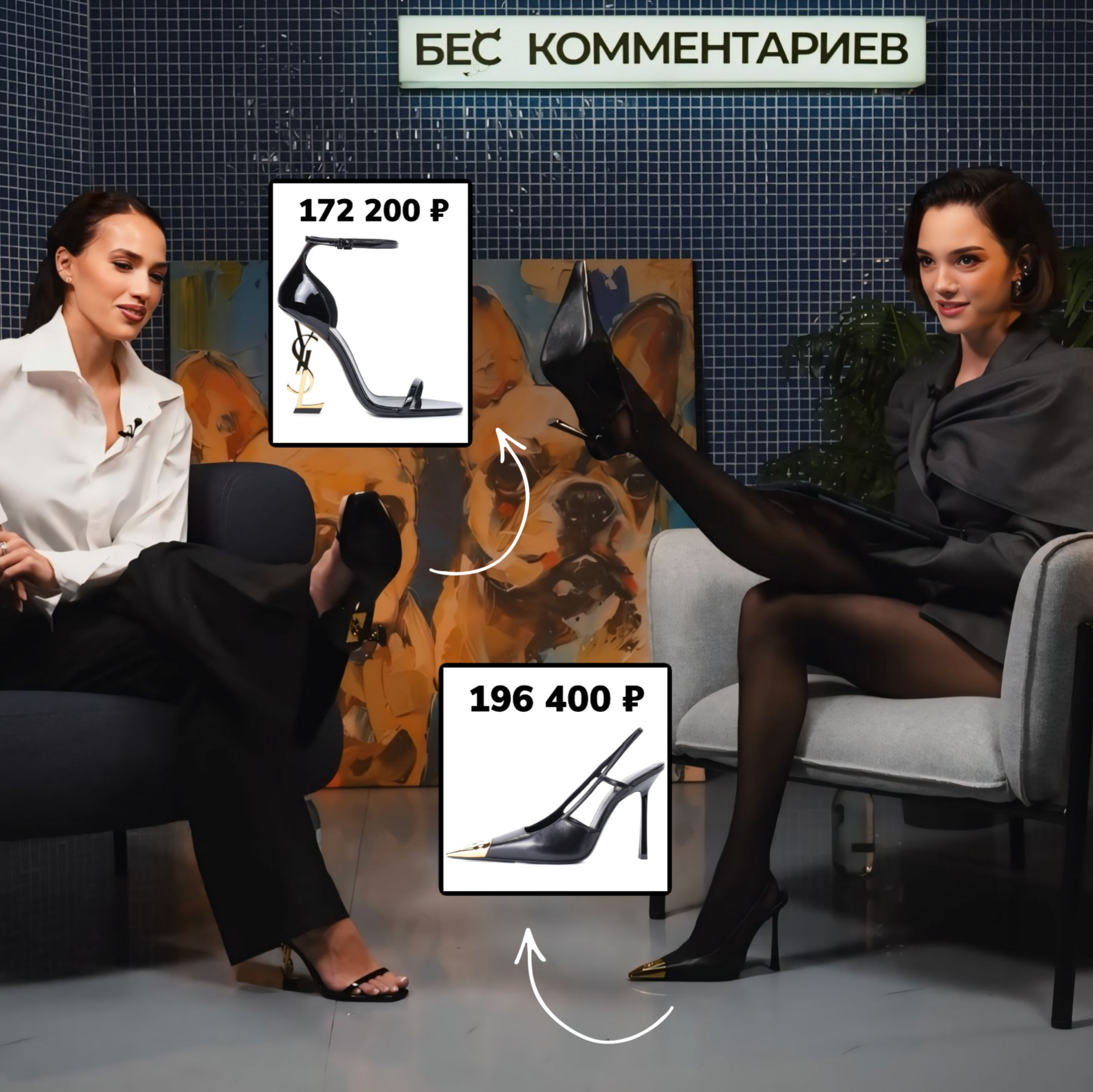 Что касается обуви, то тут даже сами Женя и Алина пошутили, что у них произошла синхронизация — Женя тоже выбрала Saint Laurent, только у нее вместо босоножек черные туфли с острым золотым носком и открытой пяткой. Цена вопроса порядка 200 тысяч рублей.