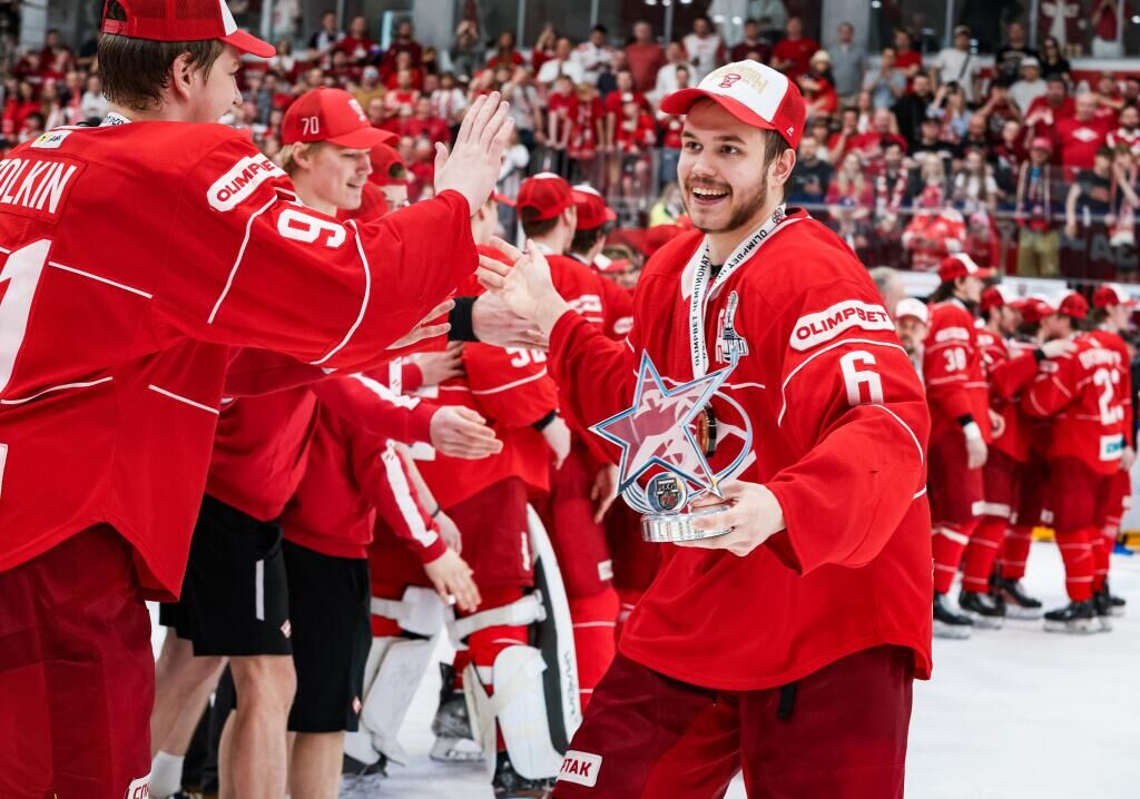 Зато это сделали игроки «Спартака», когда Иван Рябов буквально затолкал шайбу в ворота на первой минуте второго периода. Этот гол был для «красно-белых» особенно важен, ведь главная тенденция финальной серии — кто забивает первым, тот выигрывает матч. В середине периоде Макар Насретдинов удвоил преимущество «Спартака», а еще до перерыва голами обменялись Матвей Короткий и все тот же Рябов, набравший уже 28-й балл (15+13) в этом плей-офф и ставший в итоге самым ценным игроком турнира.