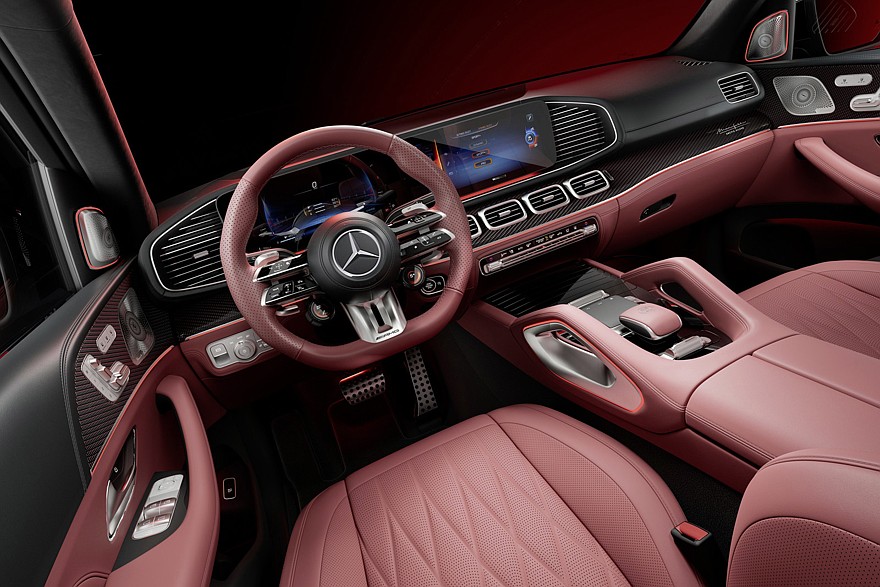 Кроме того, их «катки» получили декоративную красную окантовку по бортику. На ступицах размещена трёхлучевая звезда в красном круге с чёрной эмблемой AMG и ветвями лаврового венка. Помимо этого, за дисками видны красные тормозные суппорты.
