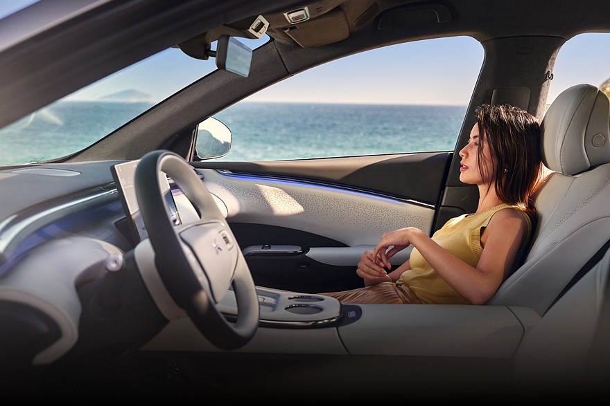 В пятиместном салоне установлены двухспицевый руль и двухэтажный тоннель, по центру красуется планшет мультимедийной системы диагональю 15,6 дюйма. Привычной приборки тут нет: Xpeng G7 стал первой моделью марки с новым проекционным дисплеем, разработанным вместе с компанией Huawei. Информация выводится почти на всю площадь лобового стекла. Вдобавок этот дисплей имеет дополненную реальность. Да и вообще, Xpeng G7 обладает искусственным интеллектом.
