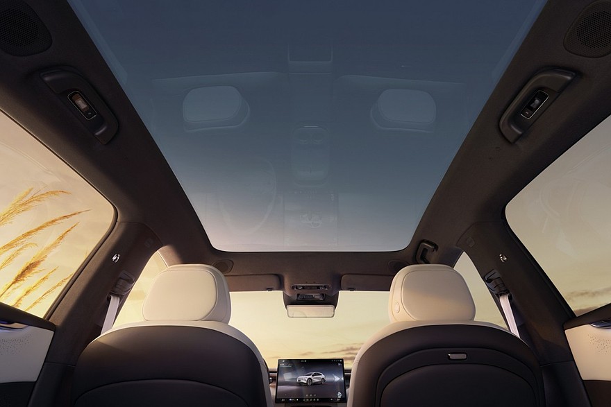 Внешность оформлена в стиле лифтбека Xpeng P7+, который дебютировал в прошлом году. В частности, паркетнику достались аналогичной формы основные фары и похожие задние фонари. Среди других особенностей дизайна электрокросса – стеклянная крыша и выдвижные ручки дверей (двери – безрамочные). Xpeng G7 «стоит» на 20-дюймовых колесах.
