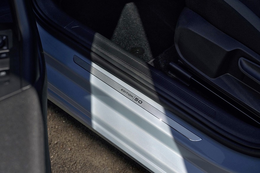 «Юбилейность» версии заметна в том числе в салоне: на порогах в проёмах передних дверей, а также на глянцевой чёрной поверхности передней панели со стороны пассажира у модели есть надпись «Edition 50». Ещё числовой индекс размещён на нижней части трёхспицевого рулевого колеса «праздничного» Volkswagen Polo.