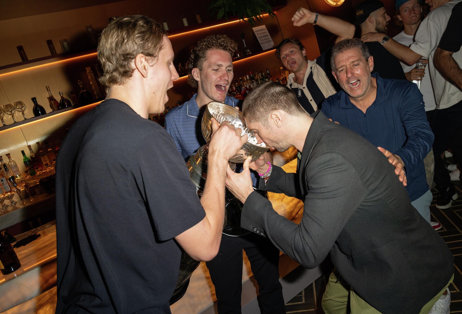 Уже по традиции празднества начались в Elbo Room — культовом баре, который был открыт в далеком 1939 году и расположен у побережья Атлантического океана. Как и в июне 2024-го, некоторые хоккеисты «Пантерз» вместе с фанатами предпочли провести утро следующего дня после решающего матча финальной серии плей-офф и ночного кутежа именно в этом заведении. С балкона бара игроки один за другим мешали шампанское с пивом и обливали все прибывающих к месту вечеринки болельщиков душем из Кубка Стэнли. Сам трофей, к слову, успел серьезно пострадать: днище кубка и ряд колец были сильно погнуты, а его основная чаша и вовсе треснула еще во время торжества на чемпионском льду арены «Пантерз».