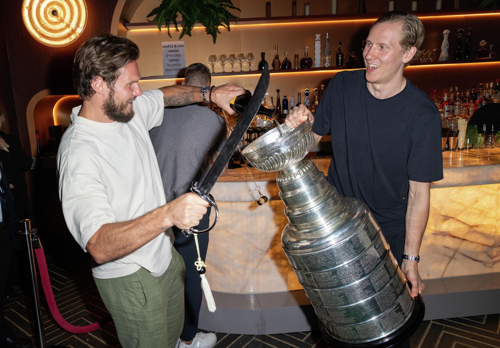 Вечером того же дня игроки «Флориды» в полном составе отправились в куда более ажурный и пафосный ресторан, что находится в Майами. Страшно представить, какой чек оставили в этом заведении обладатели Кубка Стэнли-2025 с учетом опыта участия в подобных мероприятиях у Брэда Маршанда, но на все необходимые для банкета атрибуты они не поскупились. Чемпионы устроили в ресторане самый настоящий концерт, главными звездами которого стали все тот же Маршанд, выступивший в роли истинной рок-звезды, а также капитан «Пантерз» и сын главного тренера «молодежки» московского «Спартака» Александр Барков, Сэм Райнхарт, Мэттью Ткачук и MVP розыгрыша плей-офф НХЛ Сэм Беннетт, в стиле героя Леонардо Ди Каприо из фильма «Волк с Уолл-Стрит» анонсировавший подписание нового контракта с клубом.