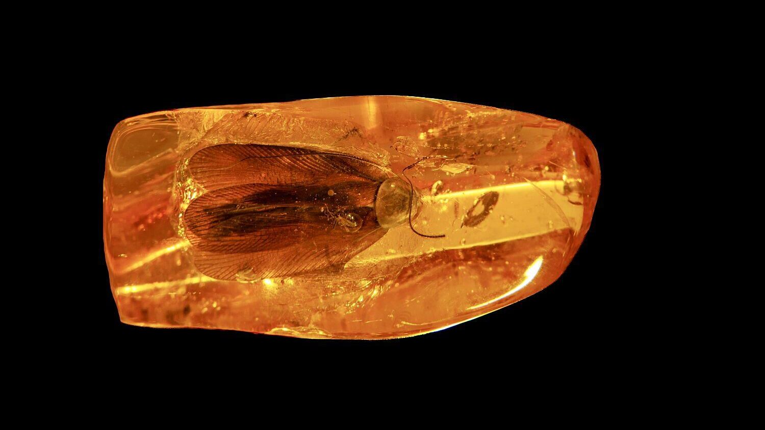 Сообщается, что инклюз был найден в процессе ручной сортировки и весит всего семь граммов. Насекомое из отряда Blattodea оказалось запечатанным в кусочке медового янтаря размером 41 на 21 миллиметр. Таракан застыв в древней смоле, расположен близко к поверхности, что позволяет в деталях рассмотреть крылья, лапы и голову насекомого.