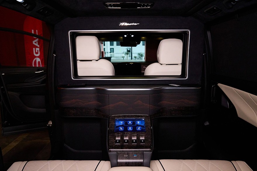 Минивэн снабдили трёхзонным климат-контролем, у каждого сиденья второго ряда есть своё устройство для беспроводной зарядки смартфона, USB-разъёмы и столики, которые можно использовать в качестве подставки для ноутбука во время работы. В перегородке расположен мини-бар с холодильником (до –10°C), потолок имеет подсветку «Звёздное небо», салон украшен серыми хромированными вставками и декоративными элементами с текстурой агатового дерева.