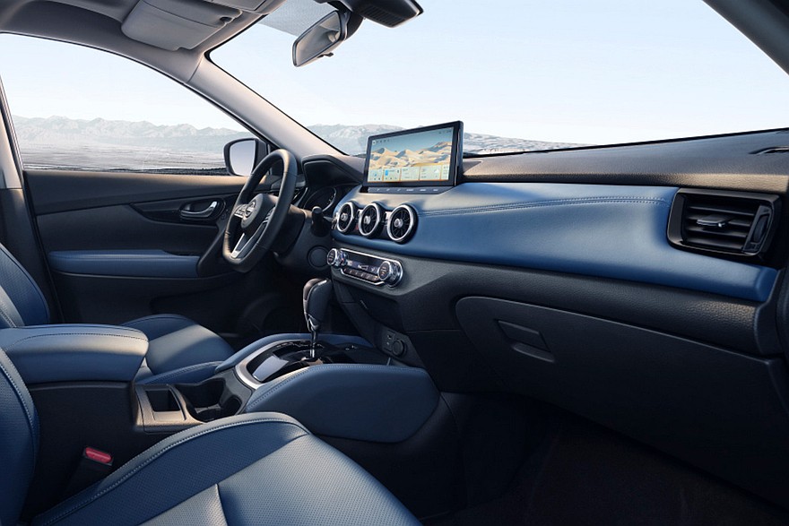 Модернизирована передняя панель. Nissan X-Trail также досталась новая мультимедийная система с планшетом диагональю 12,3 дюйма, который вдобавок возвышается над панелью (у дореформенной модели 9-дюймовый экран встроен в нее). Из-за внедрения «парящего» тачскрина центральные дефлекторы обдува пришлось перенести ниже – и это теперь три «кругляша», а не пара прямоугольников. Еще X-Trail обрел новый блок управления «климатом». Наконец, предусмотрена «кожаная» обивка синего цвета.