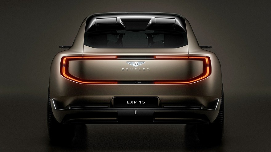Багажная дверь разделена на две части, верхняя часть поднимается вместе с задним стеклом, то есть Bentley EXP 15 — это, по сути, четырёхдверный лифтбек. На нижнем откидном борту багажной двери предусмотрены раскладные стульчики для пикника. Шампанское для трапезы приедет вместе с бокалами из недр центрального тоннеля. К интересным особенностям кормы также относятся два активных спойлера над багажной дверью, встроенный в бампер активный диффузор и тонкие фонари, стилизованные под букву «B». В передней части кузова Bentley EXP 15 есть дополнительный багажник с доступом через два проольных люка —это своеобразная стилизация под крышки моторного отсека у купе 1930 года.
