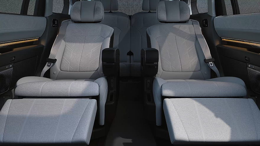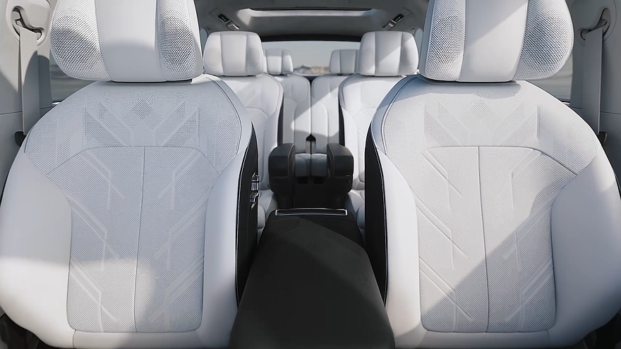 Блоки для управления регулировками передних кресел расположены на внутренней стороне дверей, под блоком управления климатической установкой установлено устройство для беспроводной зарядки смартфонов. Трёхрядный салон Zeekr 9X рассчитан на шестерых седоков (2+2+2). При этом во втором ряду установлена пара отдельных кресел с подлокотниками и оттоманками, а по центру между ними располагается отдельный дисплей.