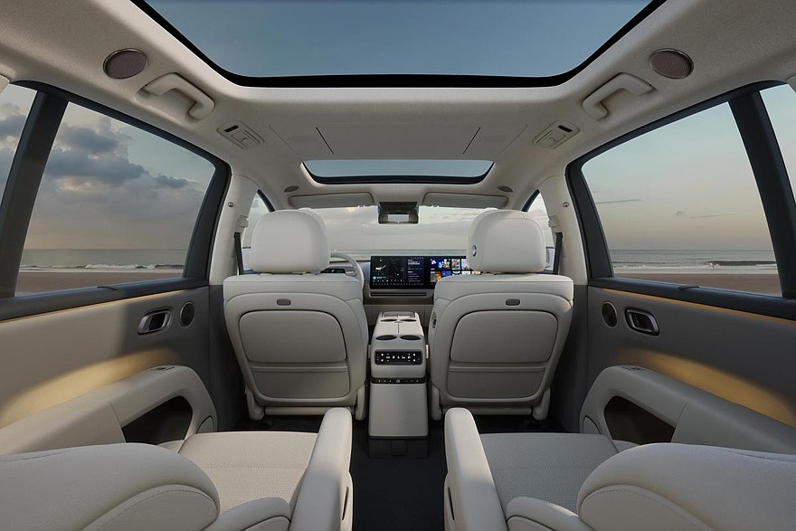 Кроссовер доступен исключительно с шестиместным салоном. Внутри – типичные для марки решения. В руль интегрирован узкий приборный экран (основная роль приборки возложена на проекционный дисплей), на передней панели расположены сдвоенные тачскрины мультимедиа (каждый диагональю 15,7 дюйма), на центральном тоннеле – две площадки для беспроводной зарядки гаджетов.