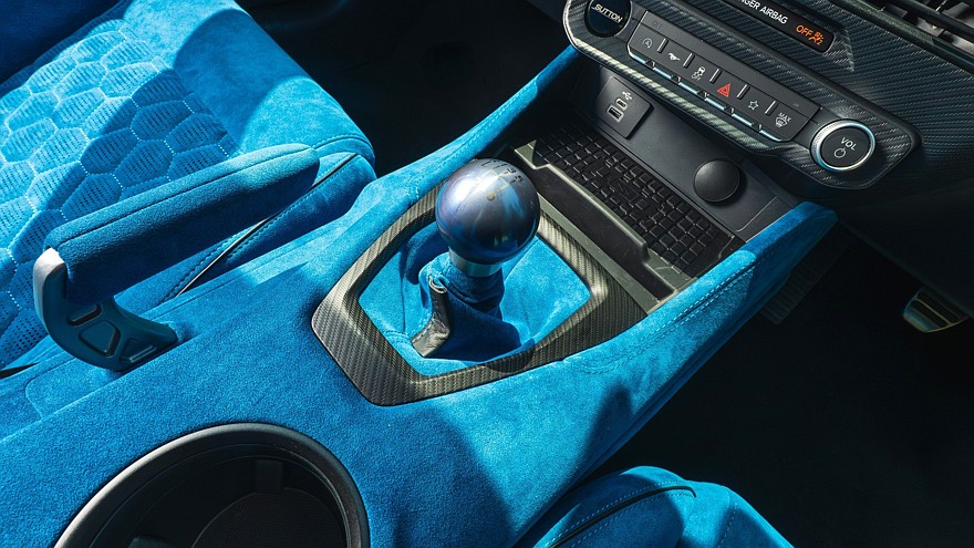 Салон Ford Mustang Dark Horse получил от британцев новую алькантаровую обивку, укороченный рычаг переключения передач MGW и новые коврики.