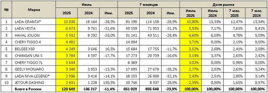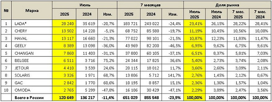 Всего же в январе-июле 2025 года, по данным «Автостата», в России продано 651 029 новых легковых автомобилей – на 23,9% меньше по сравнению с аналогичным периодом прошлого года. Среди брендов, вошедших в ТОП-10, по итогам семи месяцев 2025-го положительную динамику продемонстрировали белорусский Belgee (+36,6%), российский Solaris (+141,7%), китайские Jetour (+11,7%) и GAC (+15,1%).
