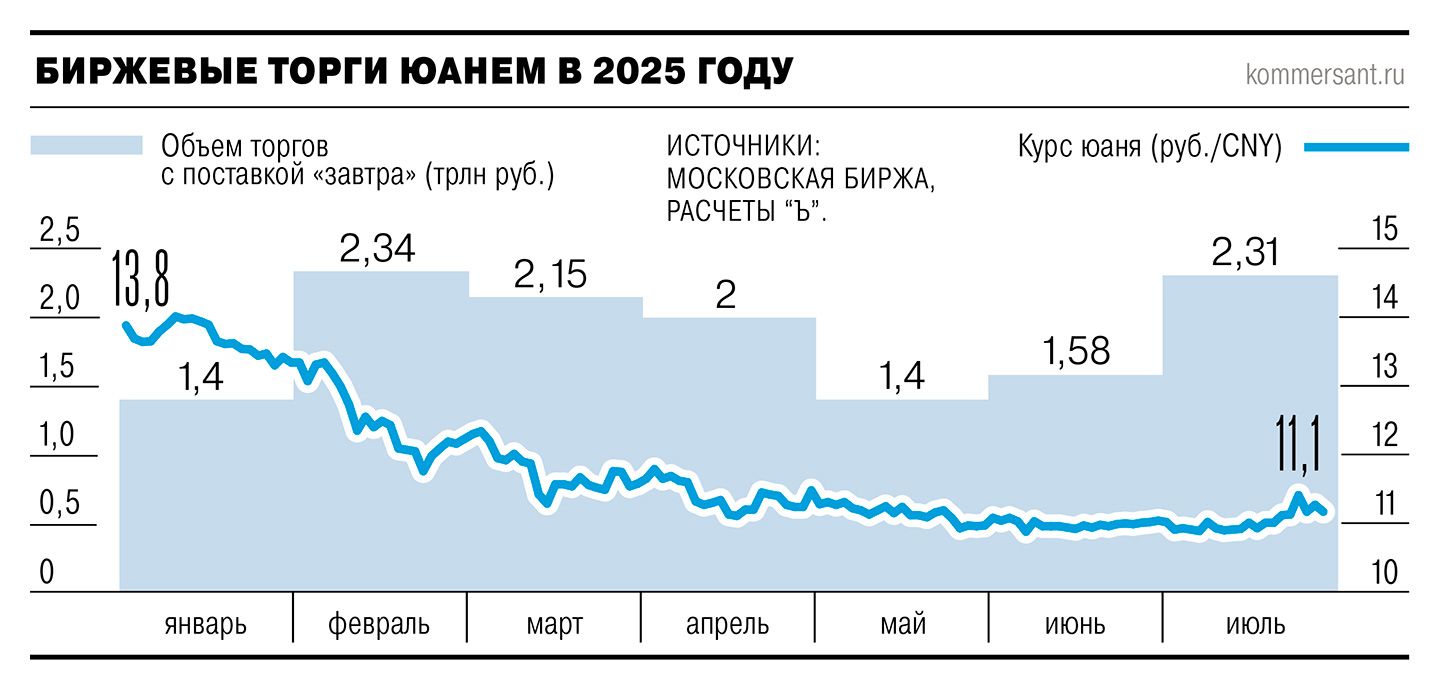 < Span Class = "Vicon Vicon-Close" > < p class = "doc__text" >Деятельность торговли с китайской валютой в июле на Московской бирже вернулась к ценностям начала года. Согласно Kommersant, на основе данных обследования участников валютного рынка, согласно результатам месяца, общая сумма торгов Юанем с предложением «Завтра» достигла 2,31 триллиона рублей, максимальная стоимость с февраля. Это почти на 46% выше июня и 20% — показатель июля 2024 года (первый полный месяц после введения жестких санкций Соединенными Штатами в связи с Московской биржей). В то же время среднесуточный индикатор вырос всего на 27%, но впервые с марта превышал отметку 100 миллиардов рублей