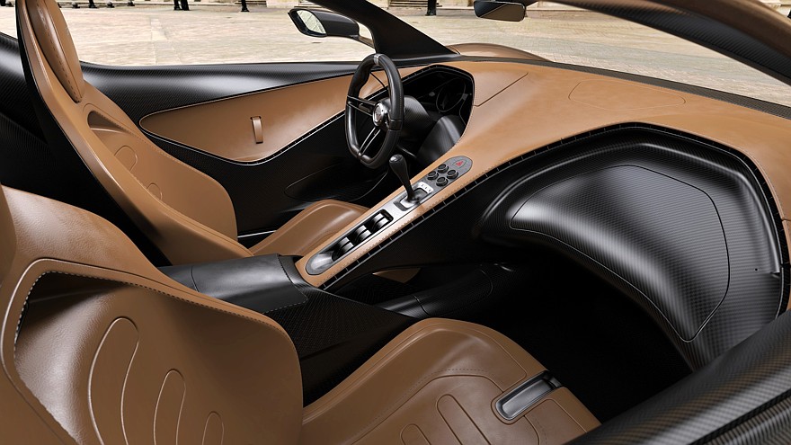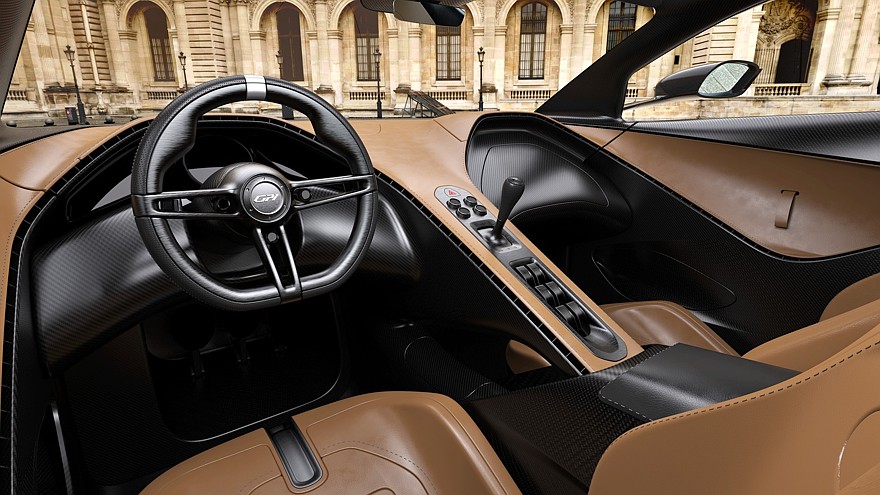 Лаконичный двухместный салон Garagisti & Co. GP1 щедро отделан кожей, под которой скрывается углепластиковая структура. Кресла водителя и пассажира разделены высокой центральной консолью с рычагом переключения передач и россыпью крупных физических кнопок. Мультимедийного экрана нет, чтобы водитель не отвлекался от дороги, мог полностью погрузиться в управление и получать чистое удовольствие от поездки. Вместе с тем обещан достаточно высокий уровень комфорта, а именно хорошая шумоизоляция и вместительный багажники — долгая дорога в этом автомобиле не будет утомительной.