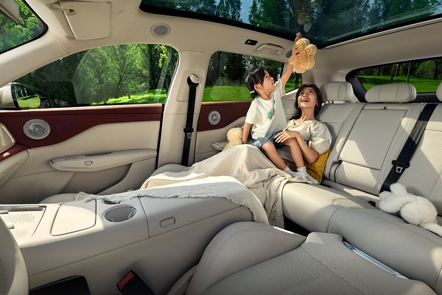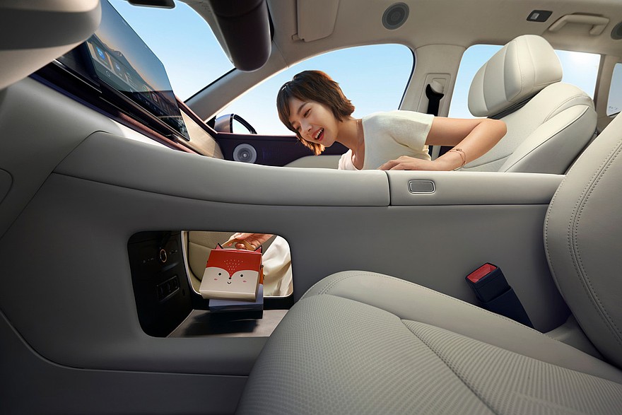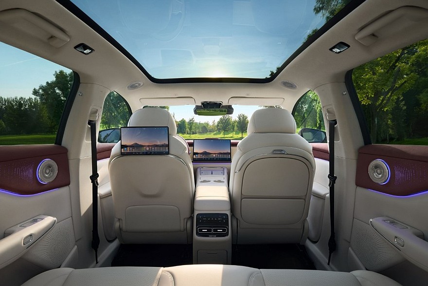 Еще переделали тоннель: на нем все так же расположены две площадки для беспроводной зарядки, за ними теперь идет отсек с крышкой и новые круглые подстаканники. В подлокотнике между передними креслами отныне спрятан бокс с функциями подогрева и охлаждения. В торце тоннеля появился сенсорный пульт управления «климатом» и «музыкой», настройками кресел. В списке оборудования также заявлены: стеклянная крыша, подогрев, вентиляция и массажер всех сидений, проекционный дисплей с дополненной реальностью, новая аудиосистема с 20 динамиками (включая динамики в подголовнике водительского кресла), откидной столик (встроен в спинку переднего сиденья) и собственный планшет для пассажиров (крепится к спинке сиденья).