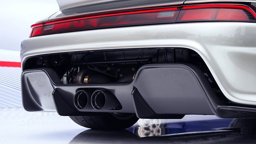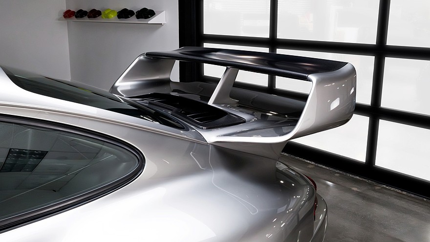 В основе Gunther Werks F-26 лежит стальной силовой каркас от донорского Porsche 911 поколения 993, жёсткость которого увеличена на 200%. Все наружные панели полностью новые, изготовленные из углепластика. Для проекта F-26 специалисты Gunther Werks разработали более эффективное аэродинамическое оперение, оно заметно отличается от того, что мы видели на её прошлых моделях — например, Gunther Werks Project Tornado. Корма выглядит особенно монструозно: на крышке двигателя установлено огромное двухъярусное антикрыло, а в задний бампер врезан широченный диффузор.