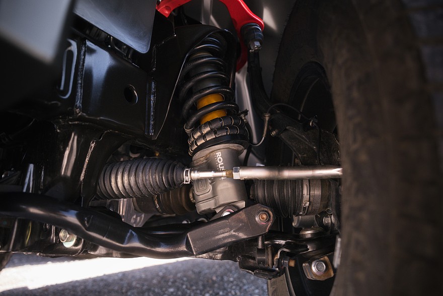 Такой пикап снабдили оригинальными 17-дюймовыми колёсными дисками, которые обуты в комплект внедорожных шин Hankook Dynapro AT2 Xtreme. Ещё Nissan Frontier Pro-4X R снабдили подвеской Roush Performance x Ohlins 2.0, которая обеспечивает подъём на 51 мм (2 дюйма). Она в том числе позволила улучшить углы въезда и съезда грузовика.