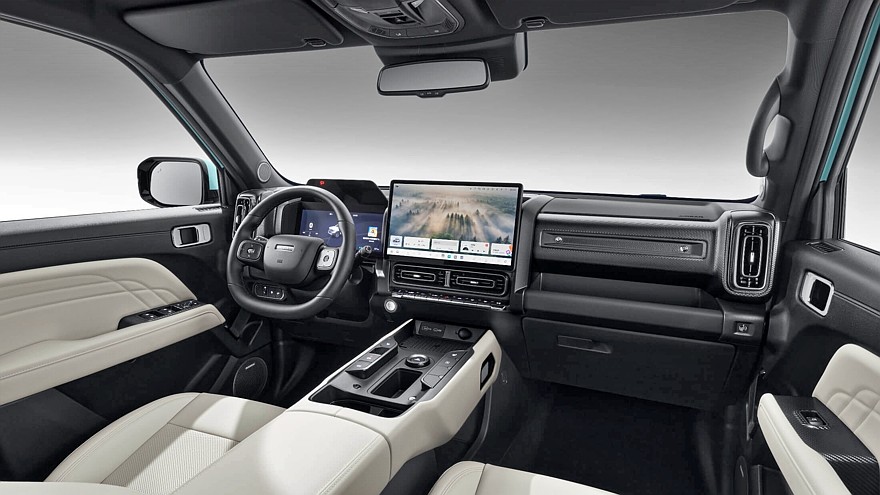 Салон у обновлённого Haval Raptor Hi4, в сущности, такой же, как у чисто бензиновой версии, с новым двухспицевым рулём и переехавшим на рулевую колонку селектором АКП. Приборный экран — 12,3-дюймовый, мультимедийный — 14,6-дюймовый. В стандартное оснащение входят проекционный экран, 50-ваттная беспроводная зарядка для смартфона, двухзонный климат-контроль, передние кресла с вентиляцией и обогревом, обивка из кожзама, мощная аудиосистема с 10 динамиками и довольно богатый набор электронных ассистентов водителя. Объём багажника — 586 л, со сложенными спинками заднего дивана — 1404 л. В багажнике есть полноценная бытовая розетка на 220 В мощностью 2200 Вт.