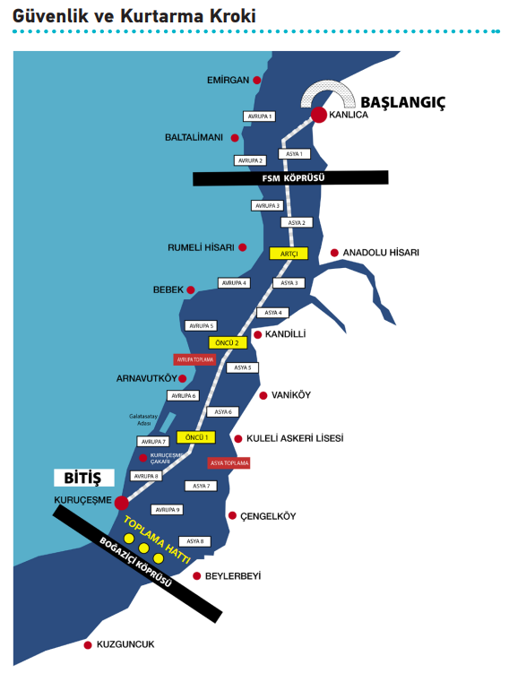 В рамках соревнований участники должны преодолеть дистанцию по направлению течения Босфора от пристани в районе Канлыджа до парка Джемиля Топузлу в районе Куручешме. Организаторы рекомендуют пловцам выбирать маршрут, ориентируясь на середину пролива, чтобы не попасть под обратные течения. Участники незадолго до дня соревнований ознакамливаются с маршрутом и проходят инструктаж. Организаторы также обязуются оснастить всю дистанцию персоналом спасателей, которые должны эвакуировать каждого пловца, который по той или иной причине не способен добраться до финиша.