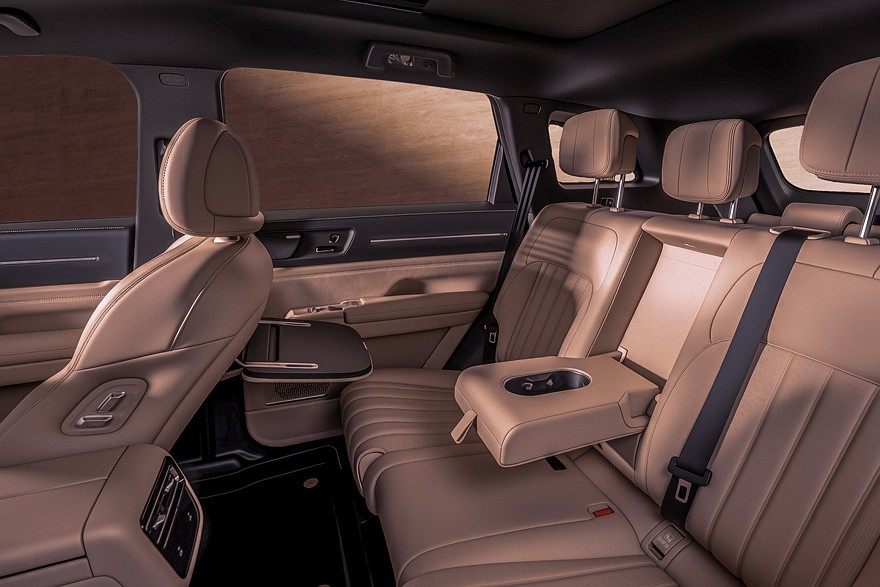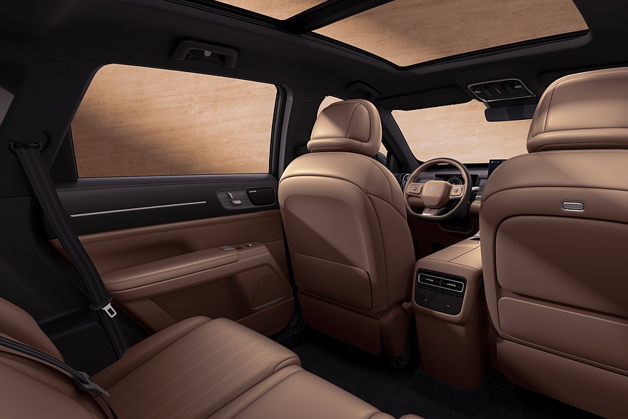 Внутри новая модель только с ДВС тоже повторила гибрид. В салоне установлены раздельные экраны приборки (10,25 дюйма) и мультимедийной системы (15,6 дюйма), трехспицевый руль и двухэтажный центральный тоннель. Мультимедиа имеет искусственный интеллект, плюс в дорогих комплектациях ее планшет можно наклонять вправо/влево. За управление трансмиссией отвечает подрулевой рычажок. На тоннеле – площадка для беспроводной зарядки, ряд «объемных» клавиш и пара неприкрытых подстаканников. Jetour X70L бывает пяти- или семиместным.