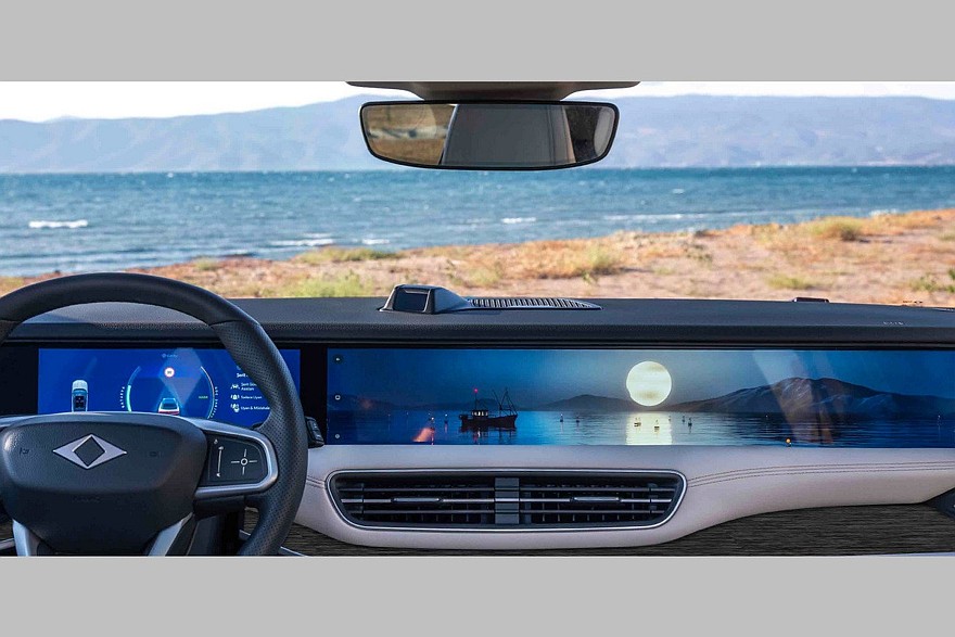 Главная фишка в салоне – табло почти во всю ширину передней панели. При этом оно состоит из двух экранов: приборки на 12,3 дюйма и тачскрина мультимедиа диагональю 29 дюймов. Под центральными дефлекторами обдува расположен еще один планшет – диагональю 8 дюймов. Все это добро идет уже в базе.