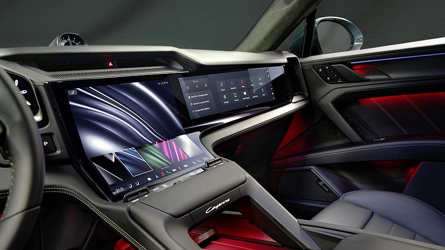 Сенсорные экраны в автомобилях давно набили оскомину, но Porsche пока никак не может угомониться и продолжает засовывать их в салоны своих новинок. Cayenne Electric «щеголяет» центральным изломанным мультимедийно-настроечным дисплеем (Flow Display), размеры которого пока не раскрыты. Нижняя часть этого дисплея используется преимущественно для настроек, при этом под ней есть ряд маленьких физических клавиш — хотя бы температуру можно отрегулировать, не касаясь экрана. Центральные воздуховоды переехали вверх и выполнены в виде узкой щели над мультимедийно-настроечным дисплеем, направление обдува теперь задаётся через экран, вручную нельзя. Этажом выше расположен секундомер — единственный прибор с настоящей, а не нарисованной стрелкой.