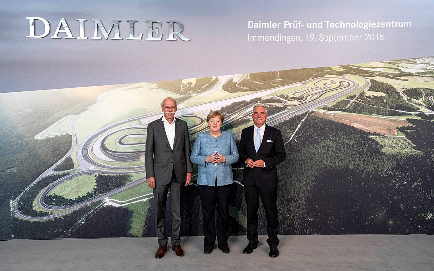 Дитер Цетше, Ангела Меркель и Томас Штробль (заместитель премьер-министра земли Баден-Вюртемберг) на открытии автополигона в Иммендингене 19 сентября 2018 года