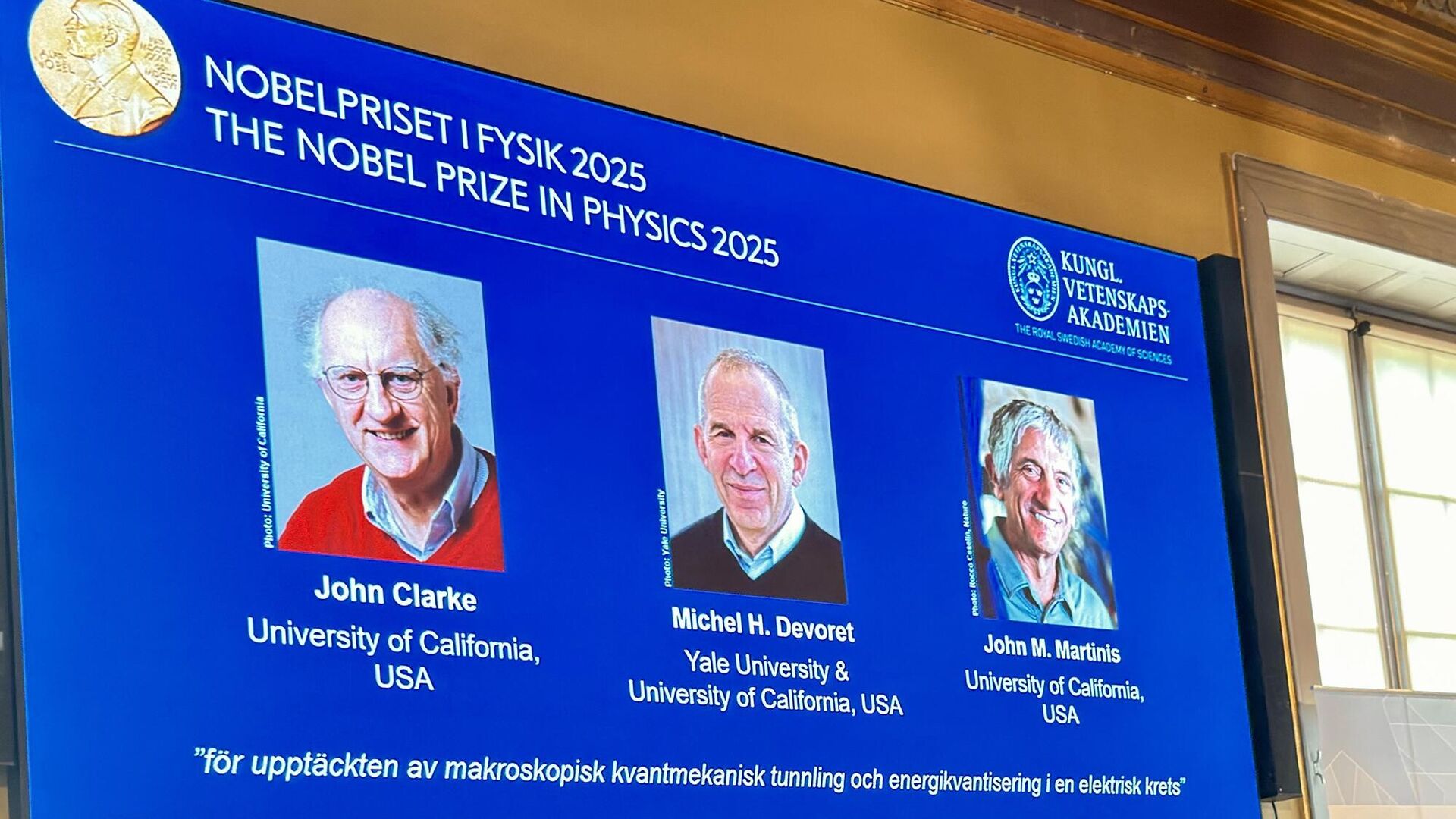 Премия присуждена британцу Джону Кларку (1942), французу Мишелю Деворе (1953) и американцу Джону Мартинису (1958) “за открытие макроскопического квантово-механического туннелирования и квантования энергии в электрической цепи”.