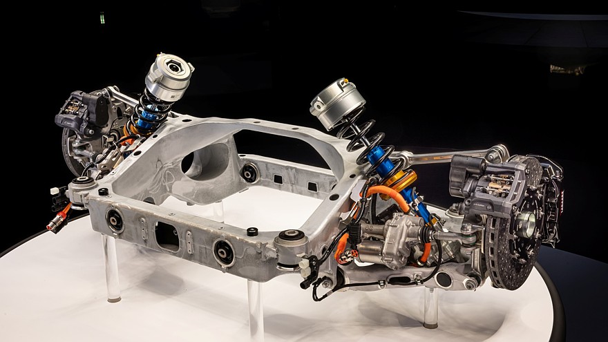 Колёсная база Ferrari Elettrica — 2960 мм, целевая снаряженная масса — 2300 кг, развесовка — 47/53 в пользу задней оси. Полностью независимая активная подвеска третьего поколения уходит корнями к кроссоверу Purosangue и флагманскому суперкару Ferrari F80, в которых, как известно используются регулируемые амортизационные стойки Multimatic с 48-вольтовыми актуаторами, но у Ferrari Elettrica своя архитектура и своя геометрия. Задняя подвеска Ferrari Elettrica вместе с задним силовым модулем крепятся к уникальному полому литому подрамнику, который в свою очередь крепится к кузову через резинометаллические шарниры или, проще говоря, сайлетнблоки — такое решение позволяет снизить уровень шума и вибраций в салоне. В заднюю подвеску вдобавок интегрирован рулевой мезанизм, чтобы сделать шасси полноуправляемым, максимальный угол поворота задних колёс — 2,15 градуса в любую сторону. Тормоза — карбон-керамические.