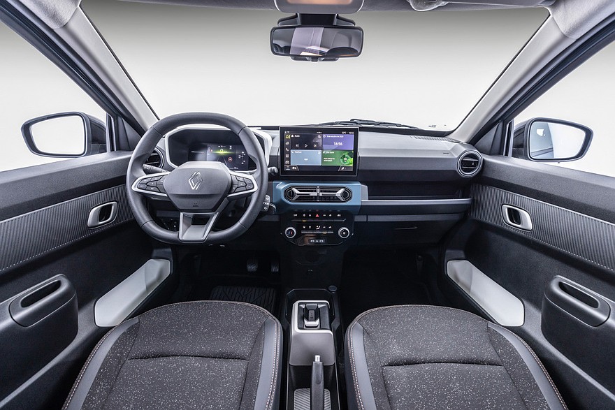 Внутри Renault Kwid E-Tech тоже изменился так же, как Dacia Spring. Тут новые руль, передняя панель, цифровая приборка (7 дюймов) и материалы отделки. Еще появился 10-дюймовый планшет мультимедиа (у дореформенного хэтча – 7-дюймовый), а за управление трансмиссией вместо шайбы теперь отвечает крохотный селектор.