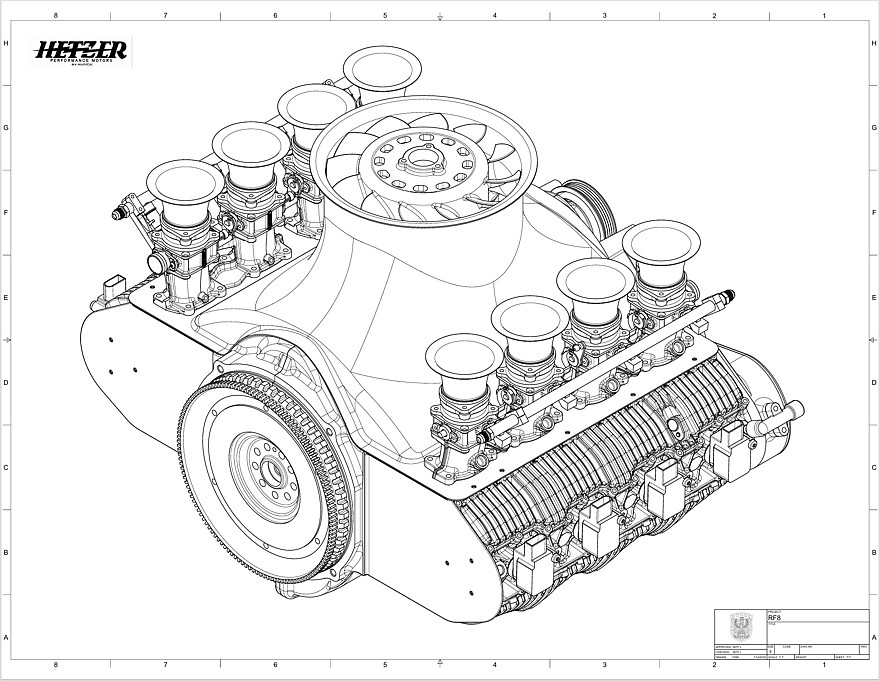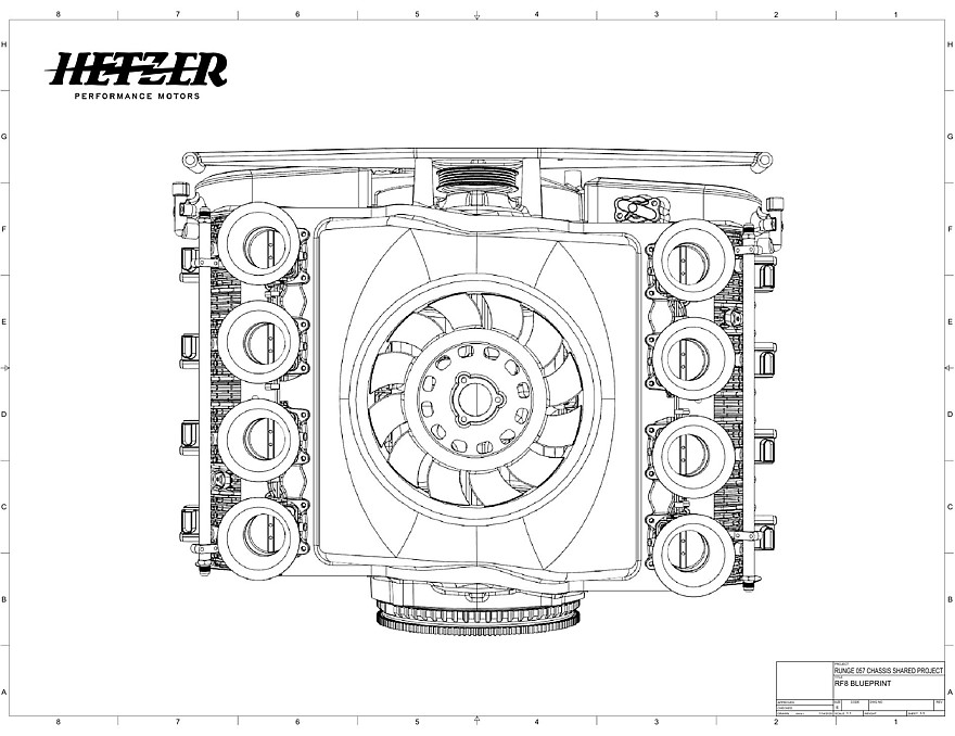 Двигатель Hetzer разработан в партнёрстве с британской компанией Swindon Powertrain, имеющий большой опыт в производстве комплектующих для классических моторов Porsche с воздушным охлаждением. В двигателе 8 цилиндров, 4 распредвала и 32 клапана. Рабочий объём — 5328 см3, диаметр цилиндра — 102,7 мм, ход поршня — 80,4 мм, степень сжатия — 12:1. Показатели мощности и крутящего момента пока не раскрыты, но по данным журнала Car and Driver, пиковая мощность мотора Hetzer будет в районе 600 л.с. Максимальная частота вращения коленвала — 10 000 об/мин.