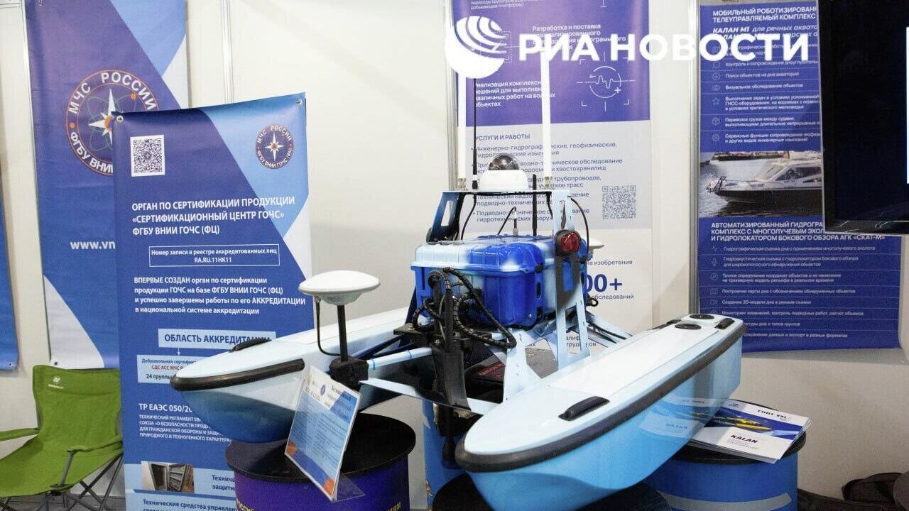 «На выставке специалисты ВНИИ ГОЧС продемонстрировали ряд уникальных разработок, среди которых выделяется катамаран «Калан» — беспилотный мобильный надводный комплекс, который может заменять водолазов при проведении опасных работ», — говорится в материалах в распоряжении .