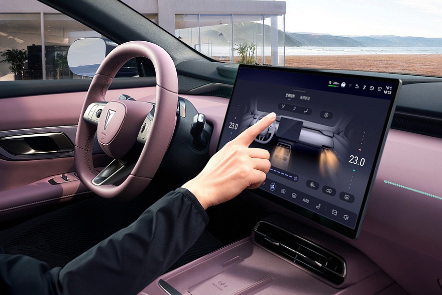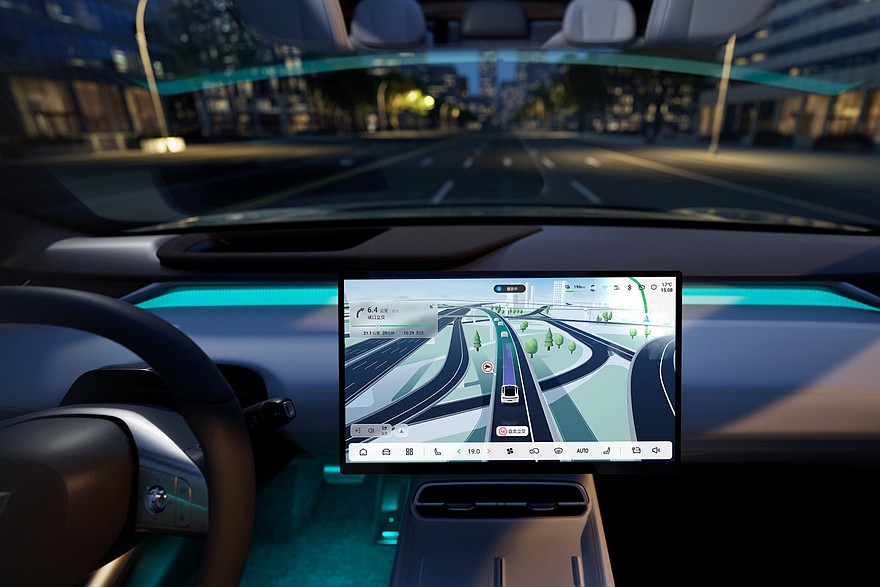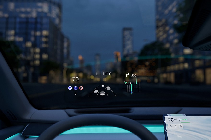 В салоне – трехспицевый руль и двухэтажный центральный тоннель. По центру установлен планшет мультимедиа-системы диагональю 15,6 дюйма. Также объявлено, что мультимедиа имеет мощный чип. Привычной приборки тут нет, вместо нее – проекционный дисплей с дополненной реальностью.