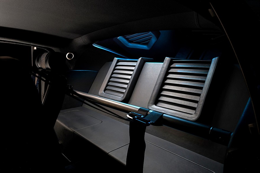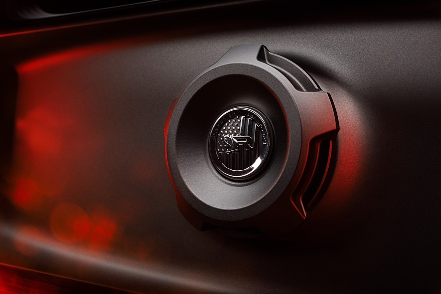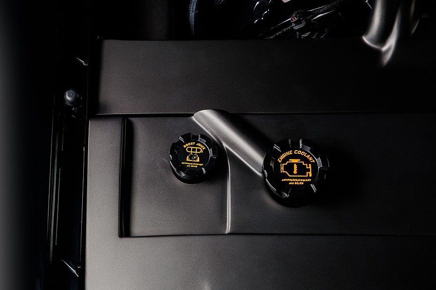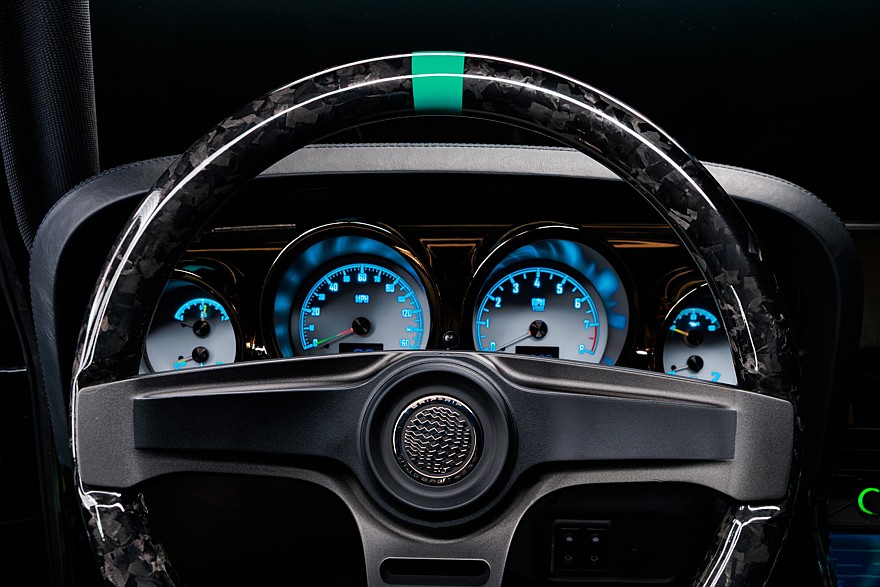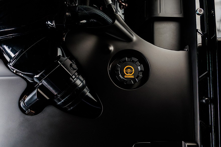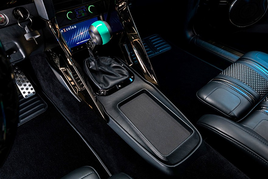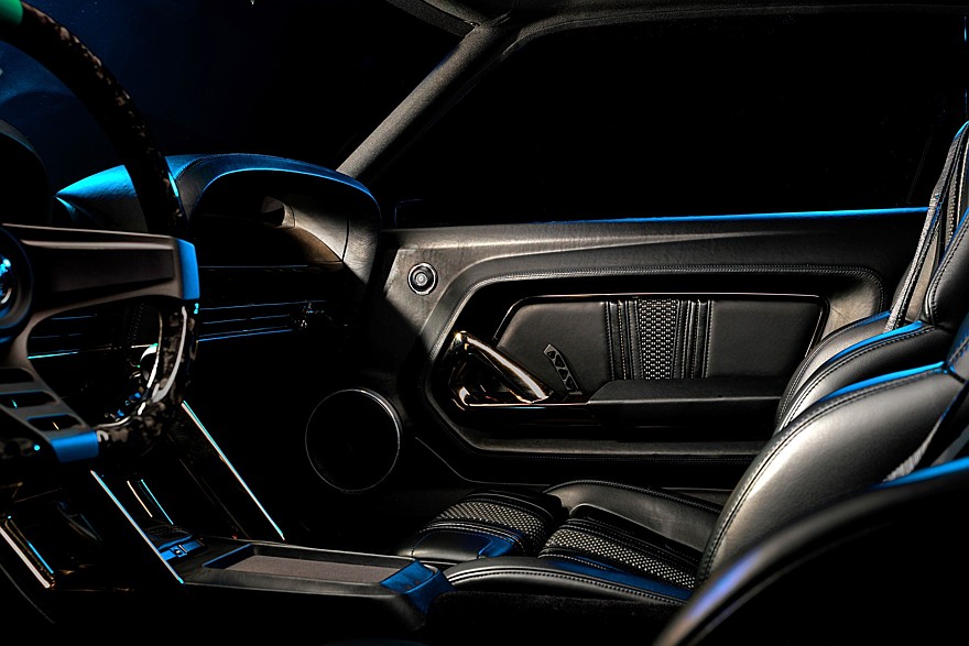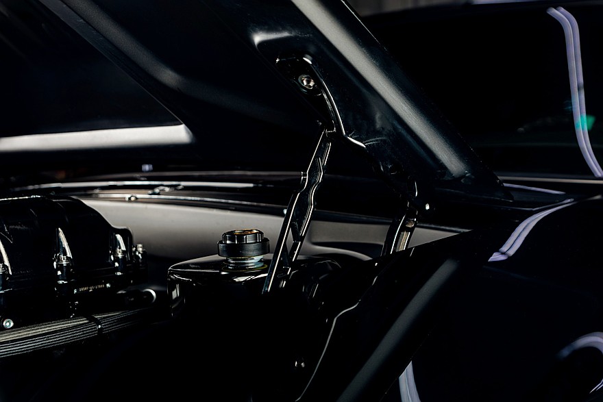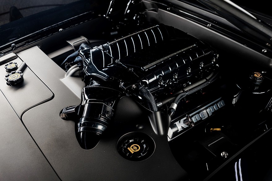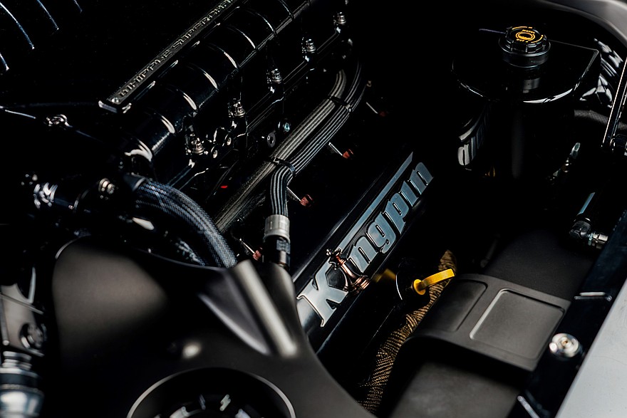 Подкапотное пространство Ford Mustang Kingpin тоже оформлено с большим вкусом, на одни только кронштейны углепластикового капота можно любоваться бесконечно. Сам двигатель полностью новый, изготовленный Wegner Motorsports на базе 5,0-литрового Ford V8 Coyote, к которому прикрутили приводной нагнетатель и сняли на выходе более 800 л.с. Вся мощность передаётся на задние колёса через 6-ступенчатую «механику» Bowler Carbon Edition. За яркий звук выхлопа отвечает выпускной коллектор Flowmaster Super 44 Series из нержавеющей стали.