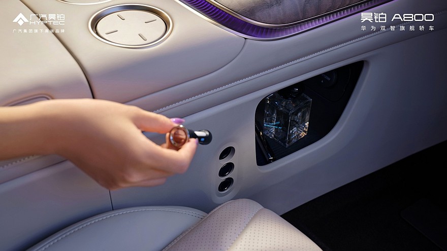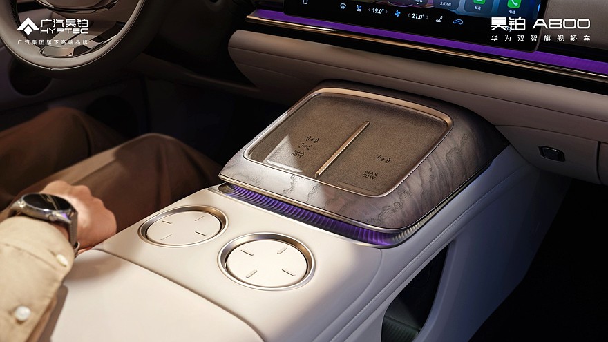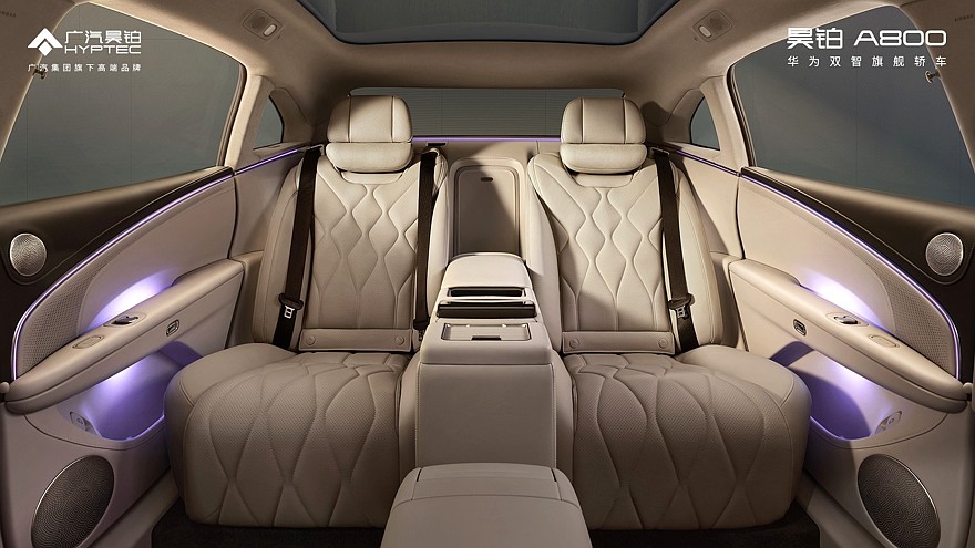Салон Hyptec A800 обещает выдающуюся тишину и уют домашней гостиной, для ног пассажиров задних кресел выделено 900 мм свободного пространства. На «лысой» передней панели разместились 10,25-дюймовый приборный экран и 14,6-дюймовый мультимедийно-настроечный планшет. Всю развлекательную электронику и комплекс электронных ассистентов водителя поставляет Huawei, а вот аудиосистема — от Infinity (14 динамиков). В недра центрального тоннеля встроен ароматизатор воздуха с несколькими ароматами на выбор.