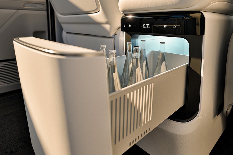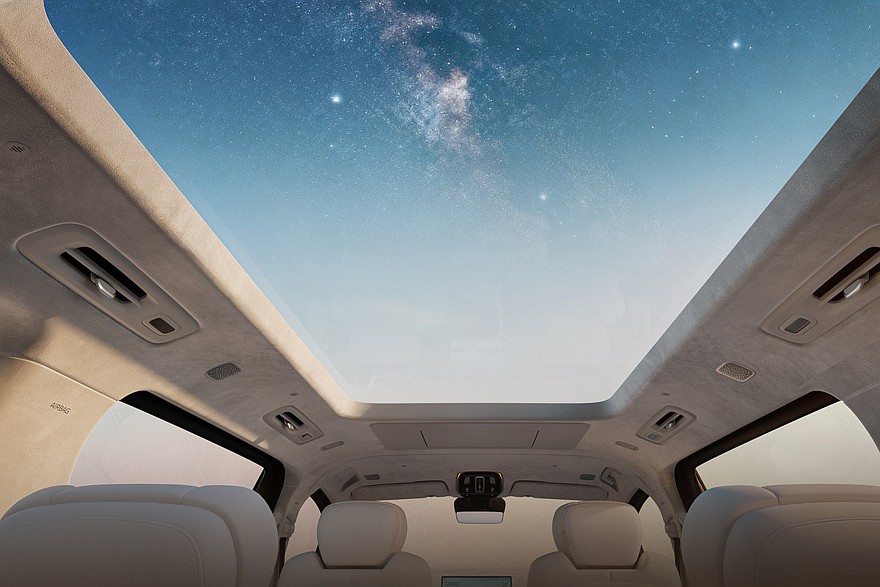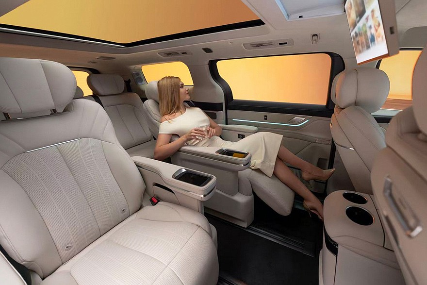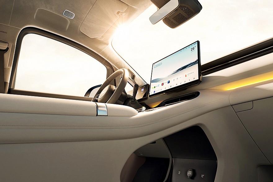 В салоне гибрида оставили раздельные приборку и планшет мультимедиа-системы. Передняя панель в принципе такая же, как у электровэна. При этом Geely Galaxy V900 получил полноценный центральный тоннель, тогда как у Geely Galaxy LEVC L380 – «парящая» консоль. На тоннеле расположены две площадки для беспроводной зарядки, шайба для управления мультимедиа, ряд физических клавиш и пара неприкрытых подстаканников. В торец встроен выдвижной бокс с функциями подогрева и охлаждения. В дорогих комплектациях для задних пассажиров предусмотрен собственный «телевизор» — он прикреплен к потолку (у электроверсии такого экрана нет). Galaxy V900 будет доступен в шести-, семи- или восьмиместном исполнениях.