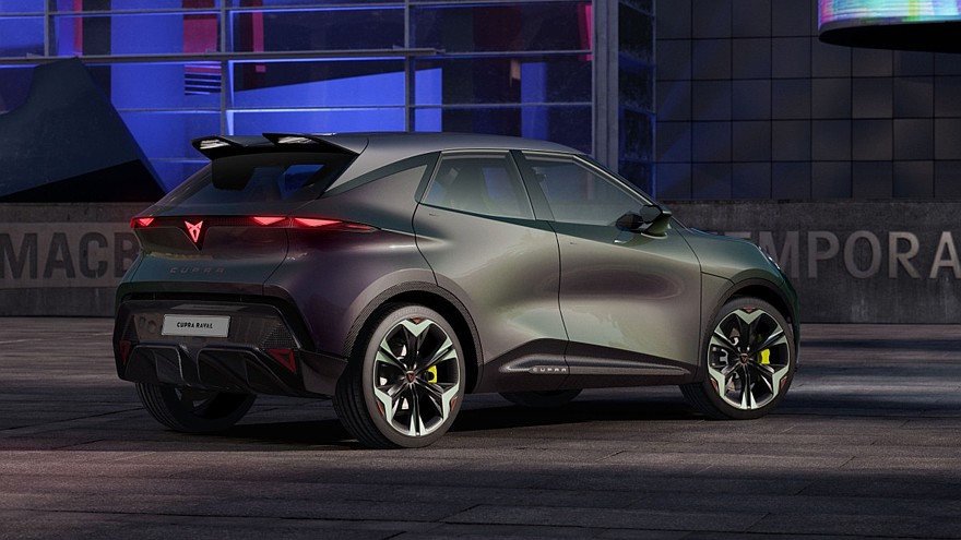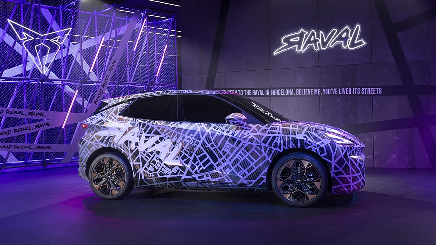 Будущая новинка Cupra получила выразительные выштамповки на капоте, крупную «раскосую» головную оптику, довольно большой воздухозаборник с сетчатым рисунком, интегрированный в нижнюю часть переднего бампера. Raval снабдили обычными наружными зеркалами, выдвижными дверными ручками, черными передними и центральными стойками крыши, а также оригинальными 19-дюймовыми колёсными дисками, рисунок которых напоминает диск циркулярной пилы.