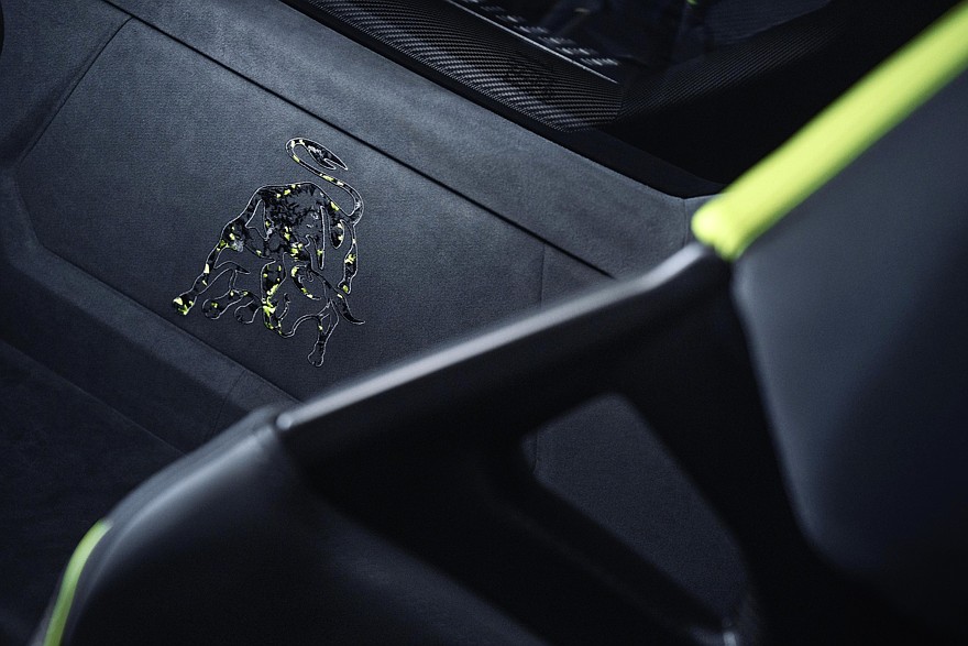 Салон Lamborghini Temerario Ad Personam декорирован цветными вставками, рифмующимися с окраской кузов, а крышка кнопки запуска двигателя и вовсе имеет тот же дивный узор, что и наружные панели. Эмблема с быком на перегородке межу салоном и моторным отсеком вышита вручную и имеет вкрапления желто-зелёного цвета Verde Shock.