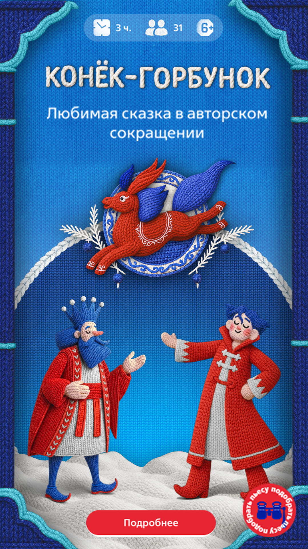 Для детей постарше подготовлены авторская версия Ивана Пачина «Путешествие Конька-Горбунка» и музыкальная сказка Полины Коротыч «По щучьему велению».