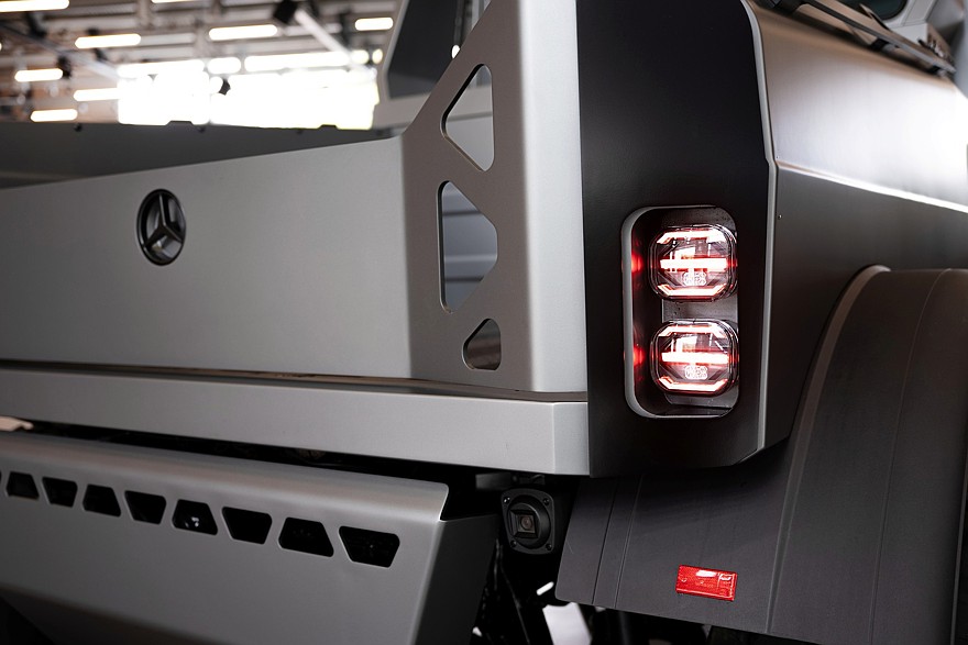 Кабину с четырьмя креслами повышенной комфортности обили двухцветной стёганой кожей и снабдили новой светодиодной подсветкой. Вставки из стёганой кожи можно увидеть также на потолке и на полу, словно это какой-нибудь Brabus — ясно, что в грязь с таким декором лучше не соваться и использовать недюжинный внедорожный потенциал грузовика только на сухом грунте.